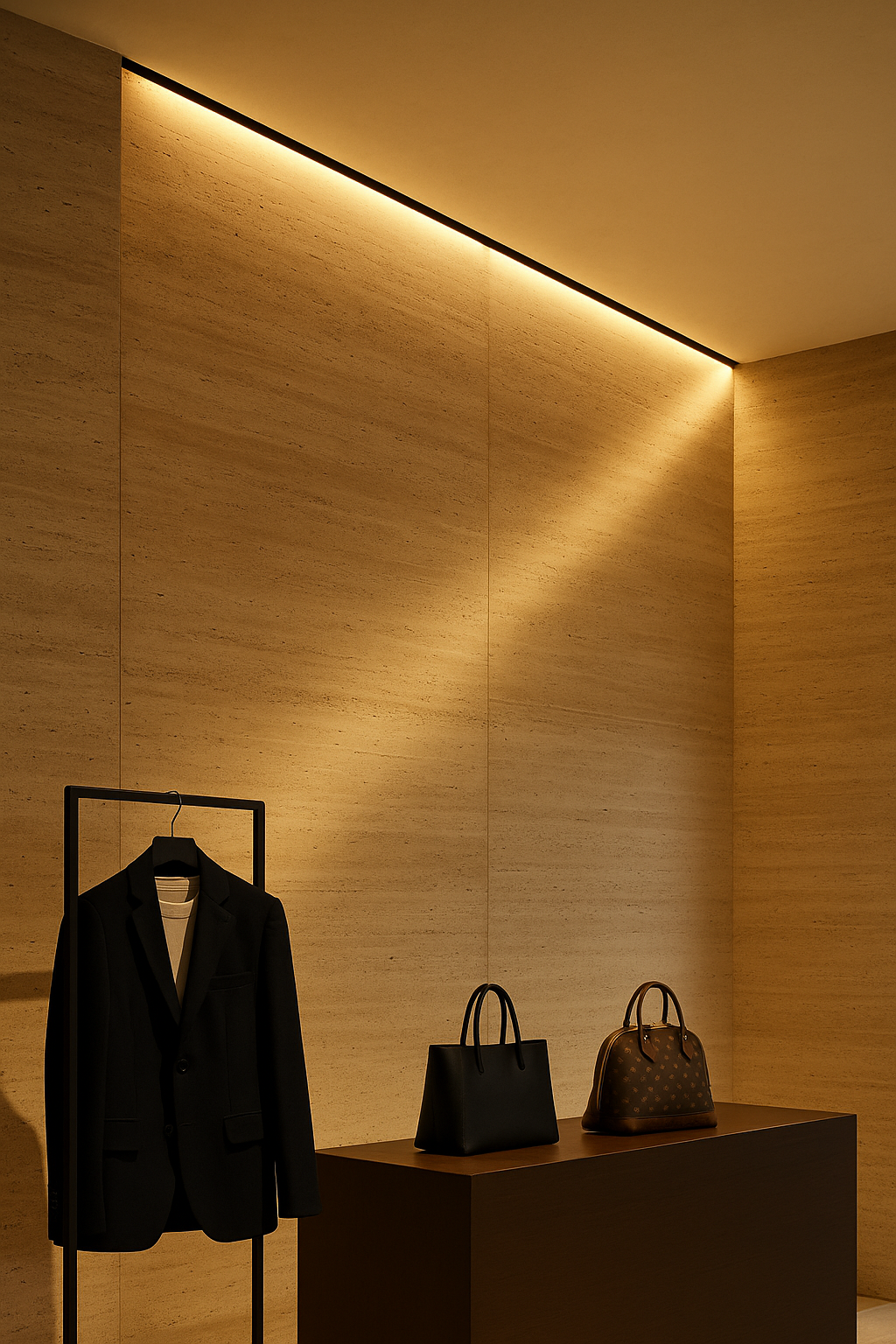 Seu design moderno e minimalista na cor preta se adapta facilmente a projetos residenciais e comerciais, valorizando sancas, móveis, paredes, nichos e detalhes arquitetônicos com um toque de estilo e discrição.